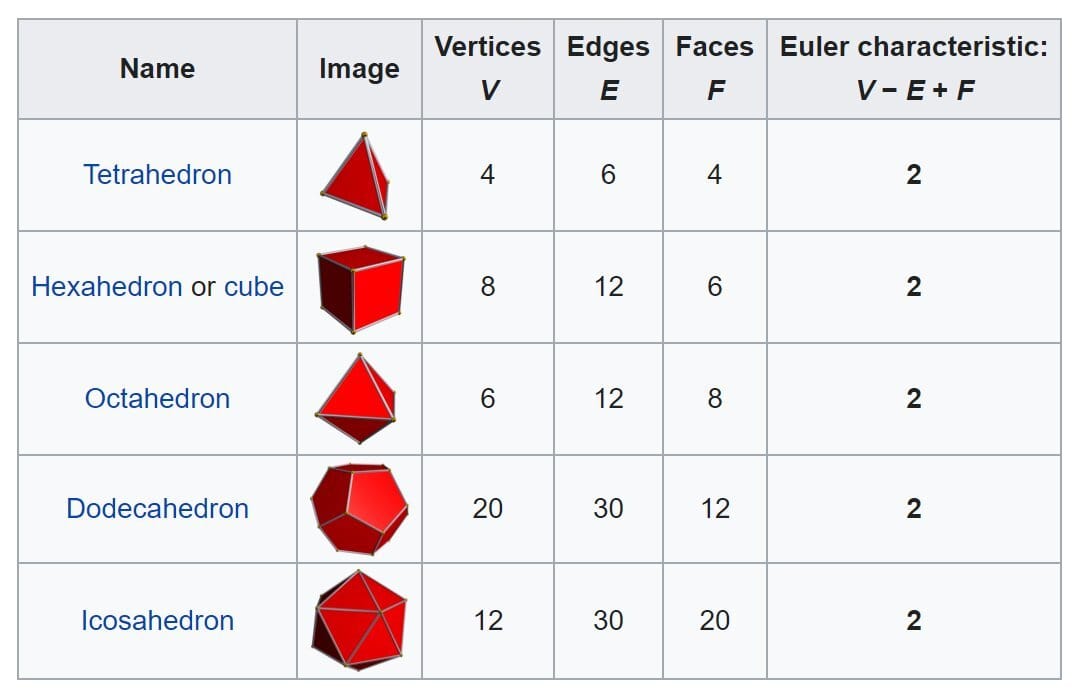 Leonhard Euler noticed in 1750 that if there are F faces, E edges, and V vertices, then V-E+F=2. For a cube, 8-12+6=2; for a tetrahedron, 4-6+4=2. This pattern applies to all polyhedrons. Such a simple observation revealed another dimension of mathematics: this result doesn’t depend on the geometric properties of the shape, but on its topological features.