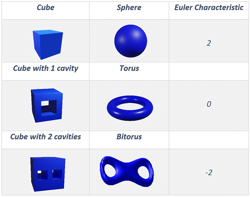 What we also notice here is that the specific shape doesn’t affect the Euler Characteristic, only the number of holes does.