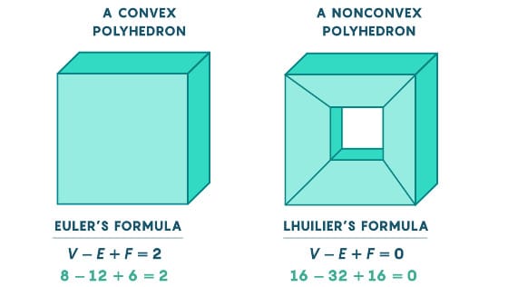Can we find examples of shapes with an Euler Characteristic that’s not two? Well, what mathematicians found was that the Euler Characteristic is two only when it’s a convex polyhedron, meaning the line segment joining any two points drawn on the surface of the polyhedron lies inside the polyhedron.